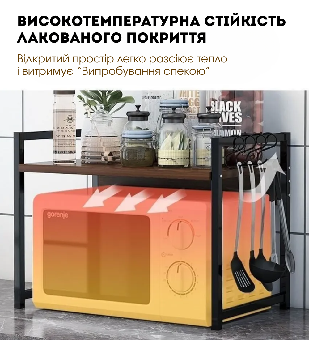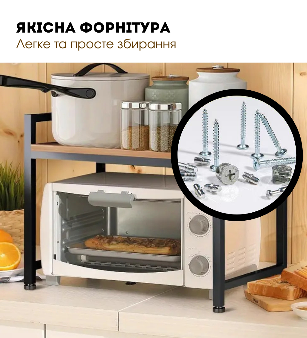 Ця кухонна полиця виготовлена з натурального дерева та високоякісної сталі, яка має міцну та довговічну конструкцію, придатну для кухонних приладів, таких як мікрохвильова піч, духовка, рисоварка та інші.
